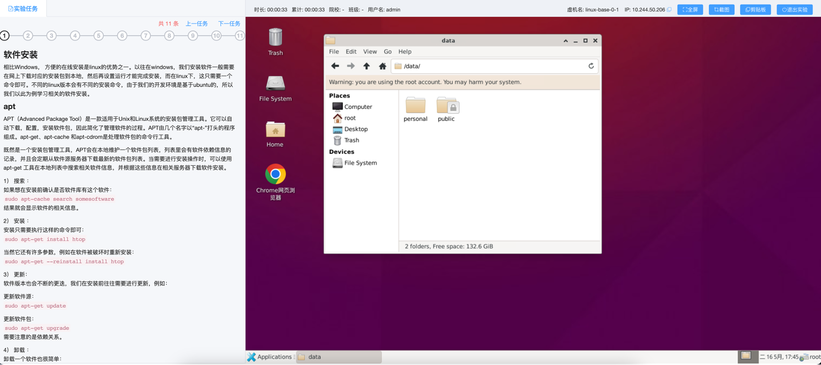 系统底层使用先进的分布式文件系统,把共享文件目录、私人文件目录无缝映射到实训的虚拟机中